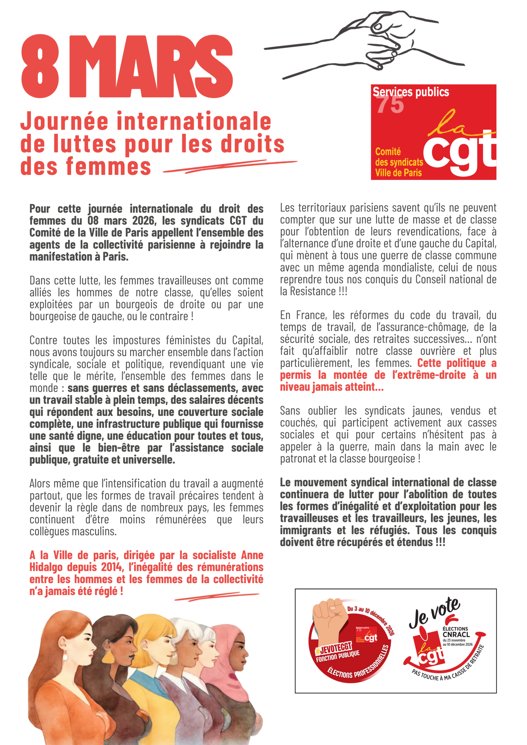 Pour cette journée internationale du droit des femmes du 08 mars 2026, les syndicats CGT du Comité de la Ville de Paris appellent l’ensemble des agents de la collectivité parisienne à rejoindre la manifestation à Paris.