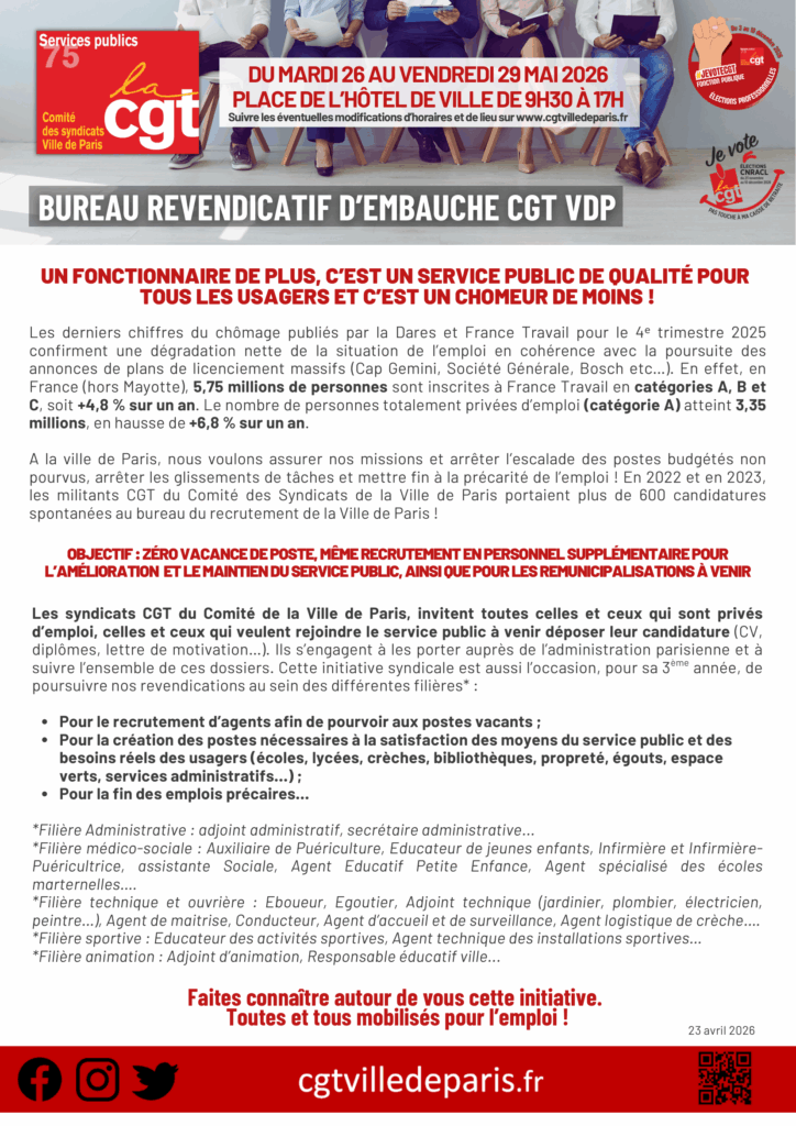A la ville de Paris, nous voulons assurer nos missions et arrêter l’escalade des postes budgétés non pourvus, arrêter les glissements de tâches et mettre fin à la précarité de l’emploi ! En 2022 et en 2023, les militants CGT du Comité des Syndicats de la Ville de Paris portaient plus de 600 candidatures spontanées au bureau du recrutement de la Ville de Paris !