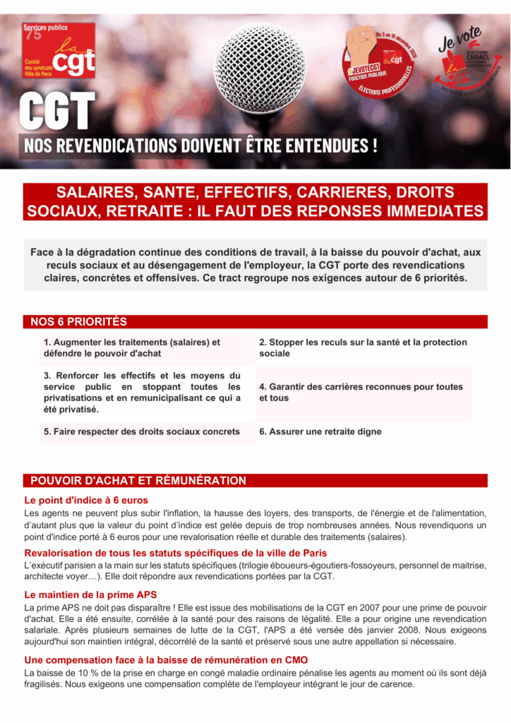 Face à la dégradation continue des conditions de travail, à la baisse du pouvoir d’achat, aux reculs sociaux et au désengagement de l’employeur, la CGT porte des revendications claires, concrètes et offensives. Ce tract regroupe nos exigences autour de 6 priorités.