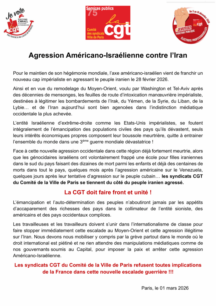 iraniennes dans le sud du pays faisant des dizaines de mort parmi les enfants et déjà des centaines de morts dans tout le pays, quelques mois après l’agression américaine sur le Venezuela, quelques jours après leur tentative d’agression sur le peuple cubain… les syndicats CGT du Comité de la Ville de Paris se tiennent du côté du peuple iranien
