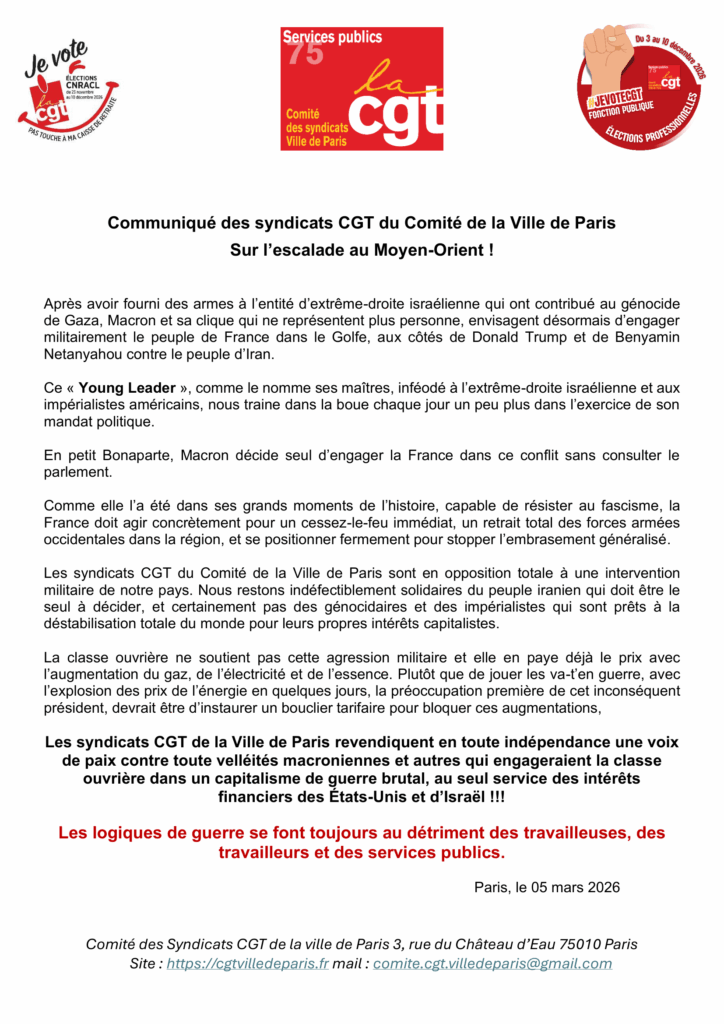 Communiqué des syndicats CGT du Comité de la Ville de Paris sur l’escalade au Moyen-Orient !