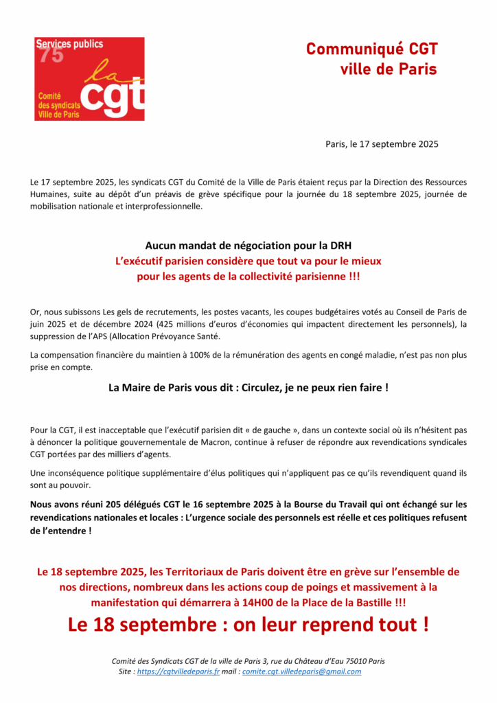 Le 17 septembre 2025, les syndicats CGT du Comité de la Ville de Paris étaient reçus par la Direction des Ressources Humaines, suite au dépôt d’un préavis de grève spécifique pour la journée du 18 septembre 2025, journée de mobilisation nationale et interprofessionnelle.