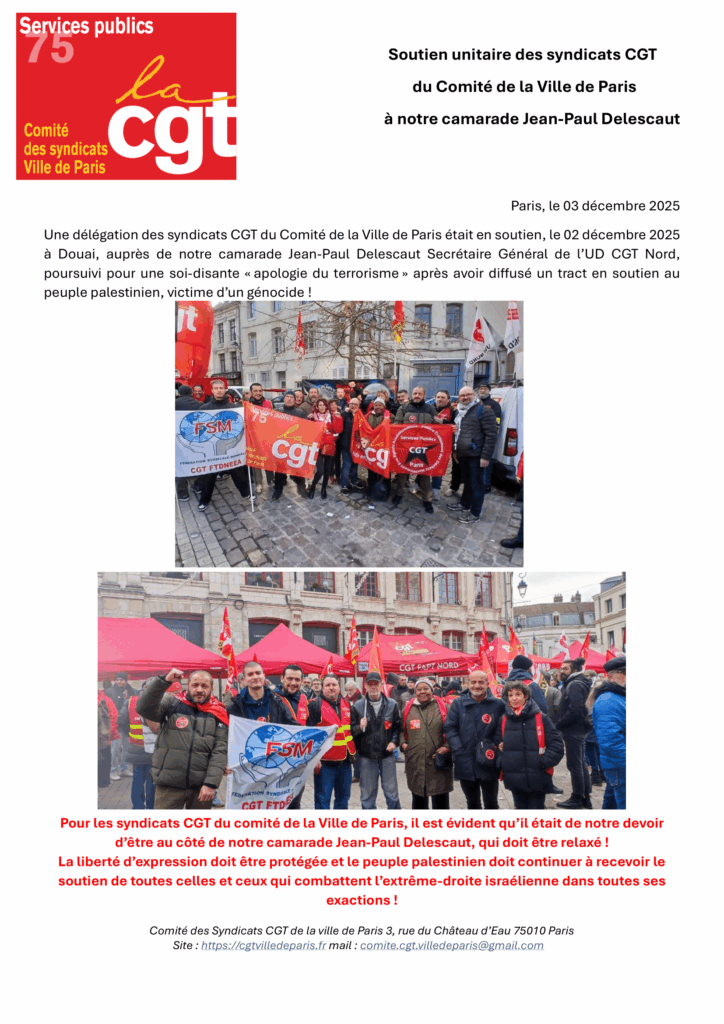 Une délégation des syndicats CGT du Comité de la Ville de Paris était en soutien, le 02 décembre 2025 à Douai, auprès de notre camarade Jean-Paul Delescaut Secrétaire Général de l’UD CGT Nord, poursuivi pour une soi-disante « apologie du terrorisme » après avoir diffusé un tract en soutien au peuple palestinien, victime d’un génocide !